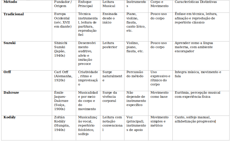 métodos ativos, esses caminhos alternativos ao modelo tradicional europeu promovem o desenvolvimento auditivo, a improvisação, a sensibilidade corporal e a escuta como base da musicalidade.